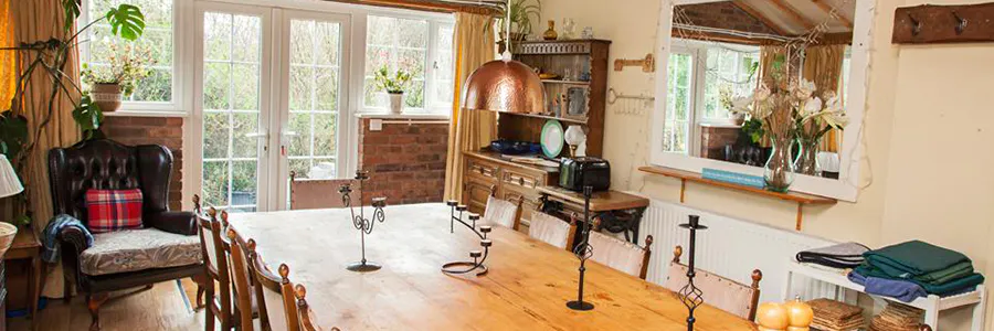 Welcoming, ‘comfy’ and characterful, Barlings Barn sleeps up to 30 in 15 bedrooms with 13 bathrooms/showers. Spacious lounge and dining room with glorious views across the valley. Very large, light filled kitchen - fully equipped, including: 2 range cookers, 4 fridge freezers, 2 dishwashers, enormous larder, pine kitchen table. The table in our dining room seats 30, for wonderful celebration meals.